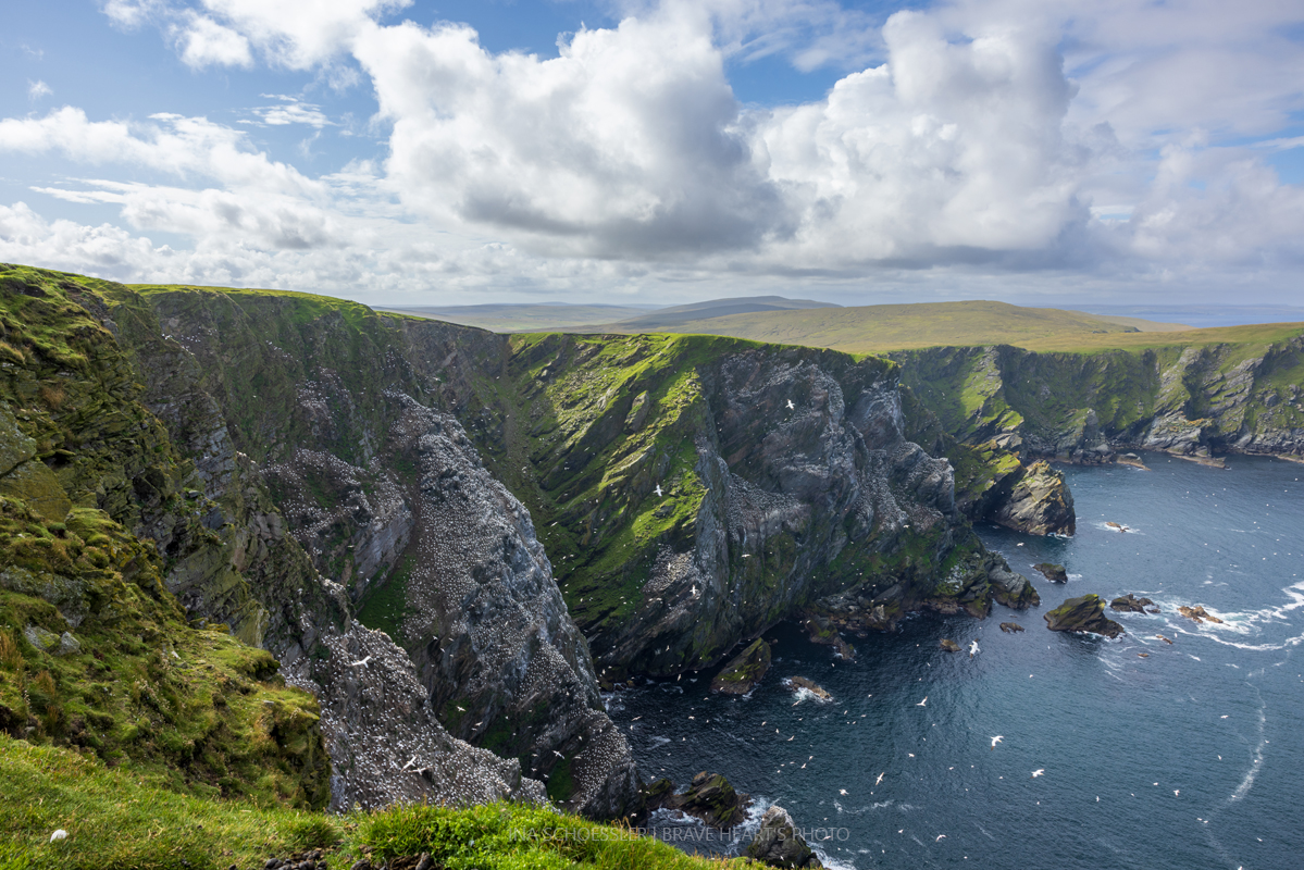 Das Wetter war ungewöhnlich mild für die Shetland Inseln. Ein HIghlight ist auf jeden Fall ein Besuch des Hermaness Nature Reserve. An steilen Klippen brüten tausende von Basstölpeln und präsentieren ihre Flugkünste über der rauen See.